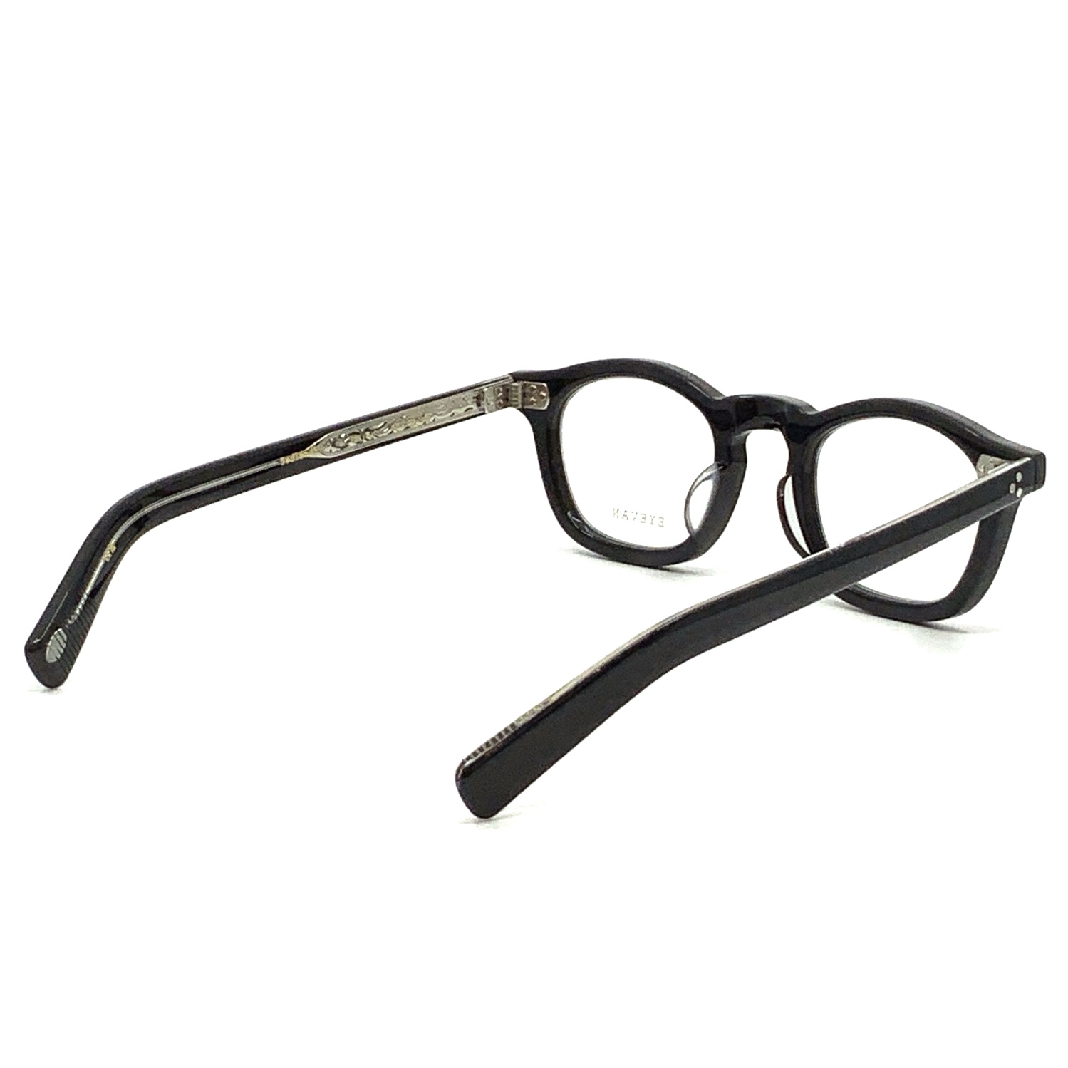 フロント、テンプル丁番には、工場に眠っていたヴィンテージのサンプルに使われていた三角形の台座の丁番をEYEVANオリジナルで再現。