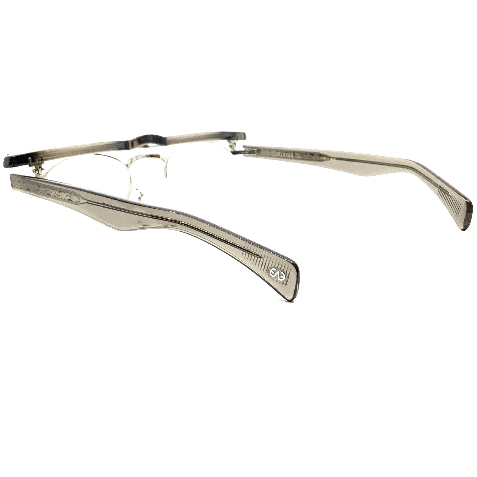 フレンチヴィンテージから着想を得た、エッヂのある肉厚なフロントと極太なワイドテンプル によってEYEVAN流にデザインした『SADLER』を大胆にもFLIP UP(跳ね上げ)仕様 にしたモデル。跳ね上げ部の丁番はバネ内蔵のオリジナル丁番を使い、ベースとなるフレームのメタルパーツはチタンを採用しすべてオリジナルで製作。テンプルはこのモデルの為に新たにデザインした。長年に渡る工場とデザインチームのリレーションシップによって、今までに見ることのなかったフレンチヴィンテージのFLIP UPという新たなカテゴリーを創造したモデル。