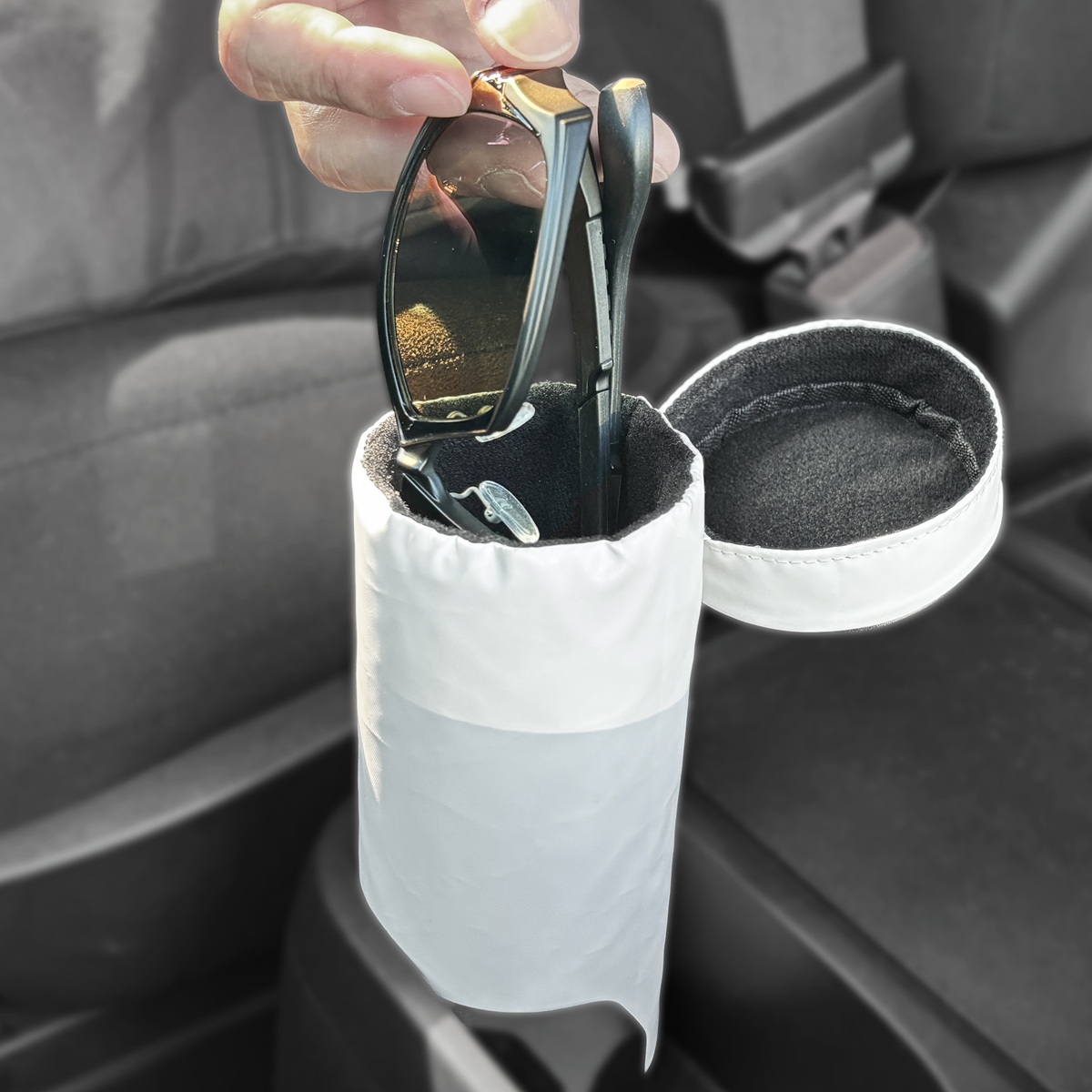 1.ドリンクホルダーにフィットする筒形状(直径10㎝)、傷防止の内面起毛生地