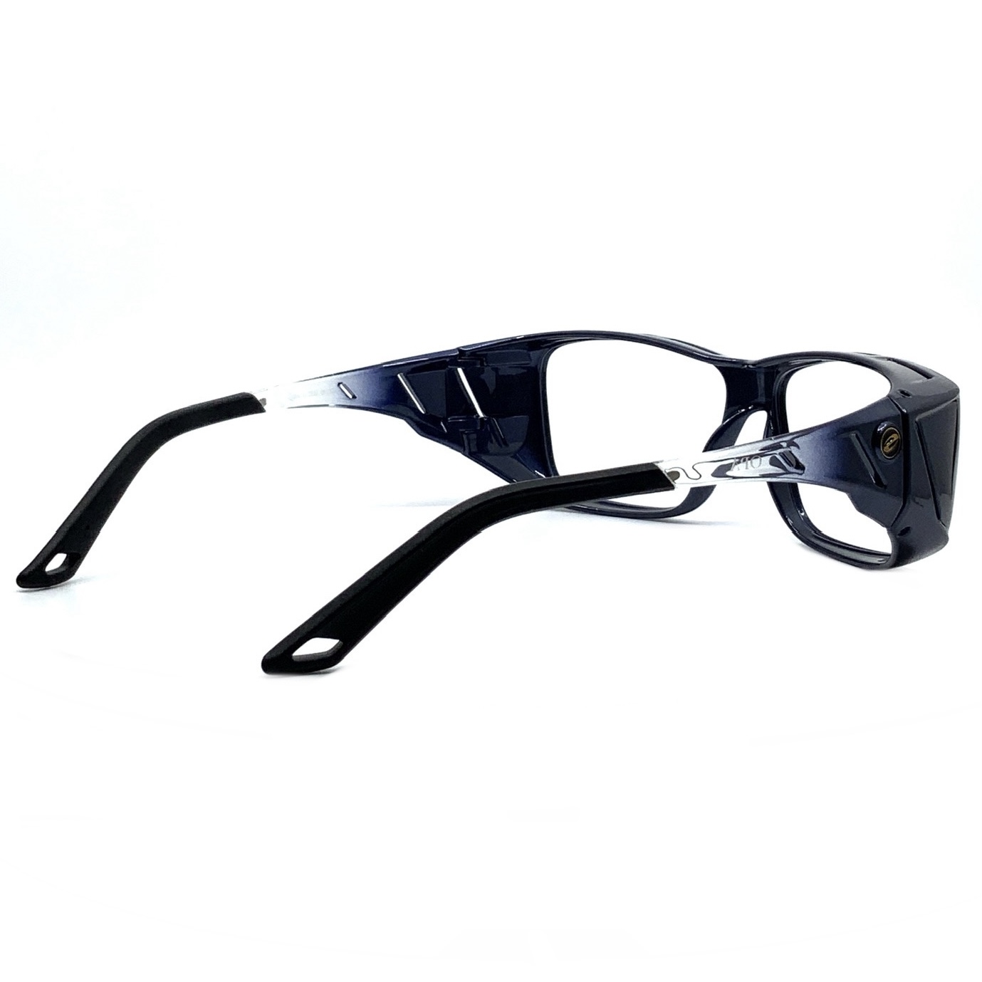フレーム各部にいくつも設けられたエアインテークが通気性を確保。確実に顔を覆う高い遮光性を備えながらも、フレーム重量22gの軽量化を実現。耳への圧迫感が少ない形状のエラストマー製モダンが汗ズレを防止。金属芯を内蔵しており眼鏡の上から重ね掛けた際のフィット感も調整可能。