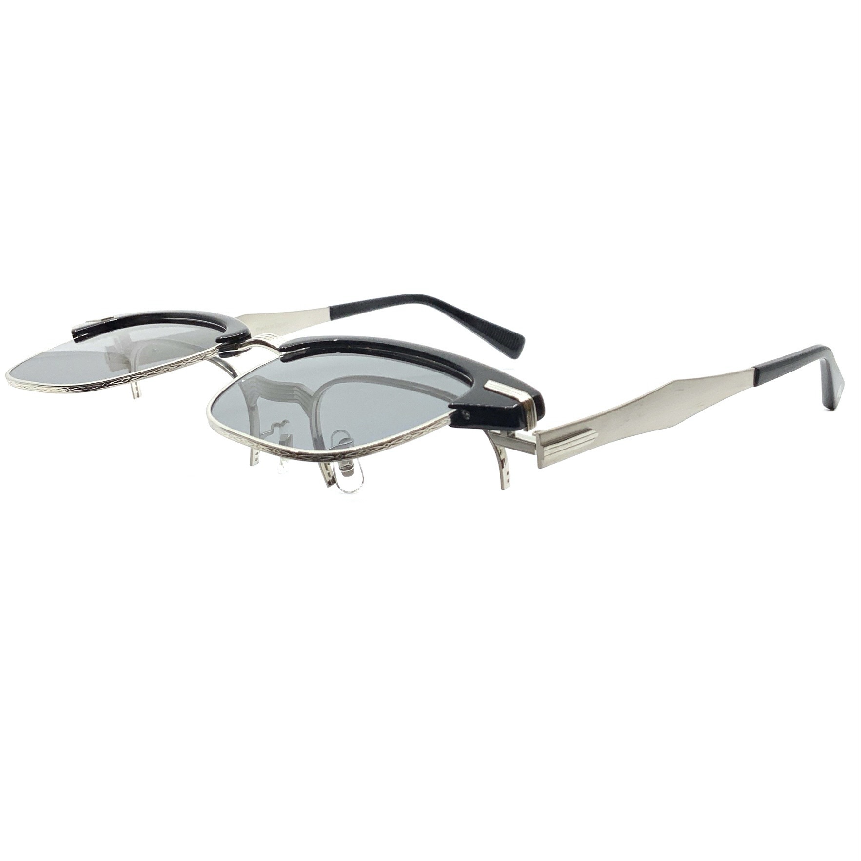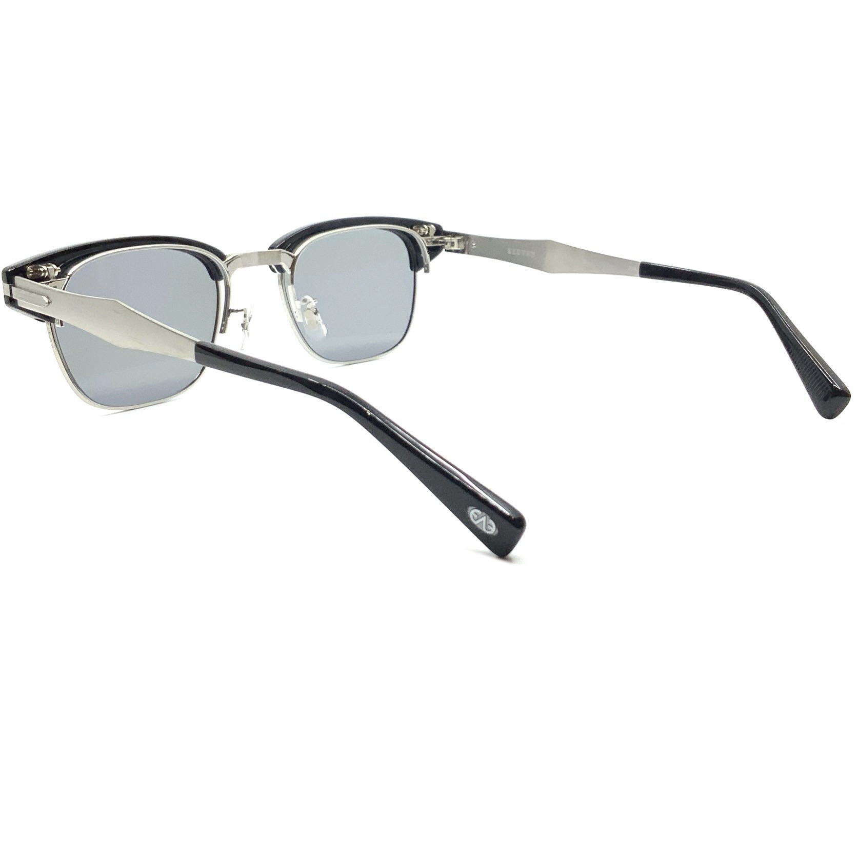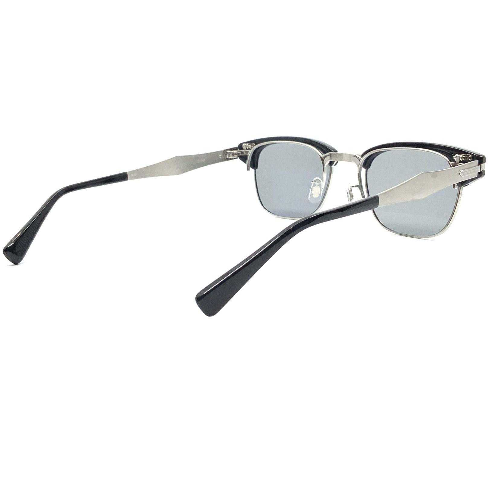 EYEVAN初となる、サーモントブロウタイプの単式(複式)跳ね上げフレーム。フロントデザインは、初代デザインチームから受け継いだ、1950年代の12KGF(12Kゴールド フィルド)が施されたアルミ製アメリカンヴィンテージに着想を得ている。軽量性に配慮 し、ベースとなるメタルパーツはすべてチタン素材で構成し、オリジナルの型から成形。 メタルパーツをチタンのみで構成した跳ね上げ式のブロウフレームは、EYEVAN独自の構造であり、専任の製造工場によって組み上げられる唯一無二の一本となった。設計から素材選定、製造工程に至るまで、長年にわたって培われたEYEVANの知見の集積が結実したプロダクトである。サングラスレンズには、オリジナルのCR39製、2カーブレンズを採用。