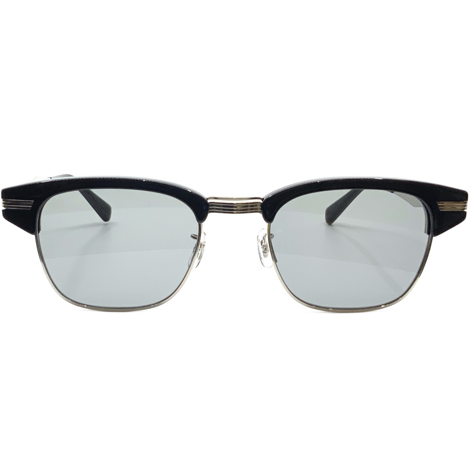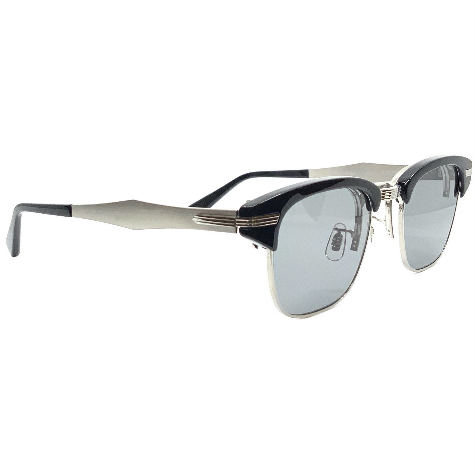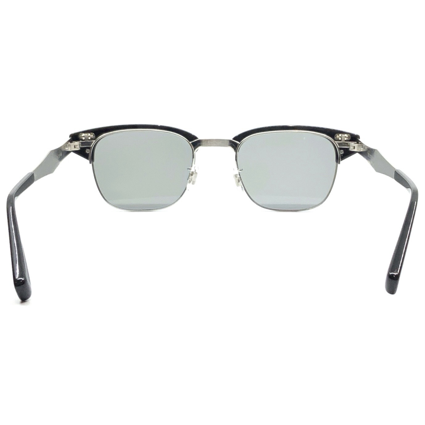 EYEVAN初となる、サーモントブロウタイプの単式(複式)跳ね上げフレーム。フロントデザインは、初代デザインチームから受け継いだ、1950年代の12KGF(12Kゴールド フィルド)が施されたアルミ製アメリカンヴィンテージに着想を得ている。軽量性に配慮 し、ベースとなるメタルパーツはすべてチタン素材で構成し、オリジナルの型から成形。 メタルパーツをチタンのみで構成した跳ね上げ式のブロウフレームは、EYEVAN独自の構造であり、専任の製造工場によって組み上げられる唯一無二の一本となった。設計から素材選定、製造工程に至るまで、長年にわたって培われたEYEVANの知見の集積が結実したプロダクトである。サングラスレンズには、オリジナルのCR39製、2カーブレンズを採用。